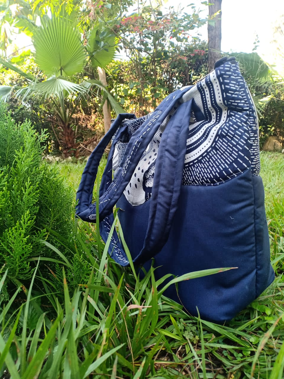 - Medium-sized dark blue handmade bag with a blue and white print. Can be used for travel, work, school, and casual purposes.